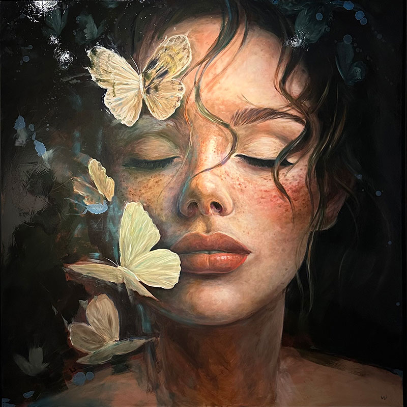 The butterflies represent gentleness and transformation. There is a magical interaction between the butterflies and the woman. Nature brings us peace.